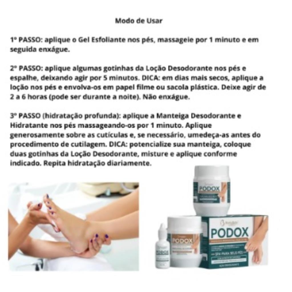 3º PASSO (hidratação profunda): aplique a Manteiga Desodorante e Hidratante nos pés massageando-os por 1 minuto. Aplique generosamente sobre as cutículas e, se necessário, umedeça-as antes do procedimento de cutilagem. DICA: potencialize sua manteiga, coloque duas gotinhas da Loção Desodorante, misture e aplique conforme indicado. Repita hidratação diariamente.