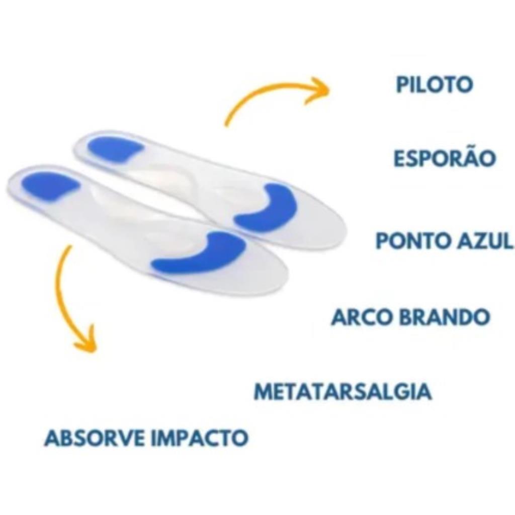 Indicada para problemas no metatarso, pé diabético, atrofia nos panículos adiposos, calosidades, entorses, tendinites, dor plantar resultante de artrite e esporão de calcâneo. Traz maior conforto para portadores de pés diabéticos na absorção de impacto, e também na prática atividades físicas. Seu ajuste anatômico é perfeito, adaptando-se aos mais variados tipos de sapatos e conferindo sua indicação na ortopedia e prática de esportes. Modelo especial porque contém duas ogivas "pontos" Azul, a redução nestes pontos são mais acentuados. O Ponto Azul é ogiva situada na região do calcâneo que faz com que neste local haja um alívio mais acentuado da pressão que esta parte do pé sofre diminuindo, assim, a dor e desconforto. A palmilha plana especial - ponto azul pode ser usada por qualquer pessoa no tratamento de dores e patologias dos pés. Tem como principal função reduzir a pressão, o atrito e o impacto causados nos pés sobre a região azul proporcionando alívio de dores plantares. Proporciona ótimos rendimentos à prática de esportes que exigem um grande esforço sobre as articulações, melhorando o rendimento dos atletas.